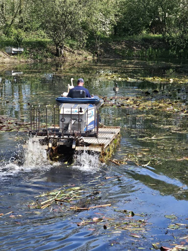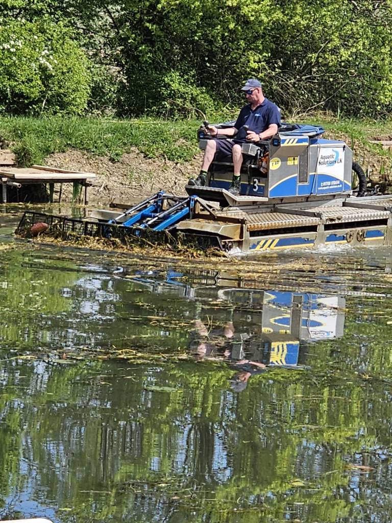 The two new pools at Libbery, Island pool and Jim’s pool will very soon be ready to open. All the work installing the 34 new fishing platforms across the two pools has now been completed as well as all the work that has been already done allowing access to the pools. All that remains was to remove the extensive weed growth from the years of neglect after previous sitting club. This work was a massive undertaking and to big even for our band of loyal members who have already put many hours of hard labour into the project. We had to call in a specialist contractor, Aquatic Solutions UK to complete the work.
