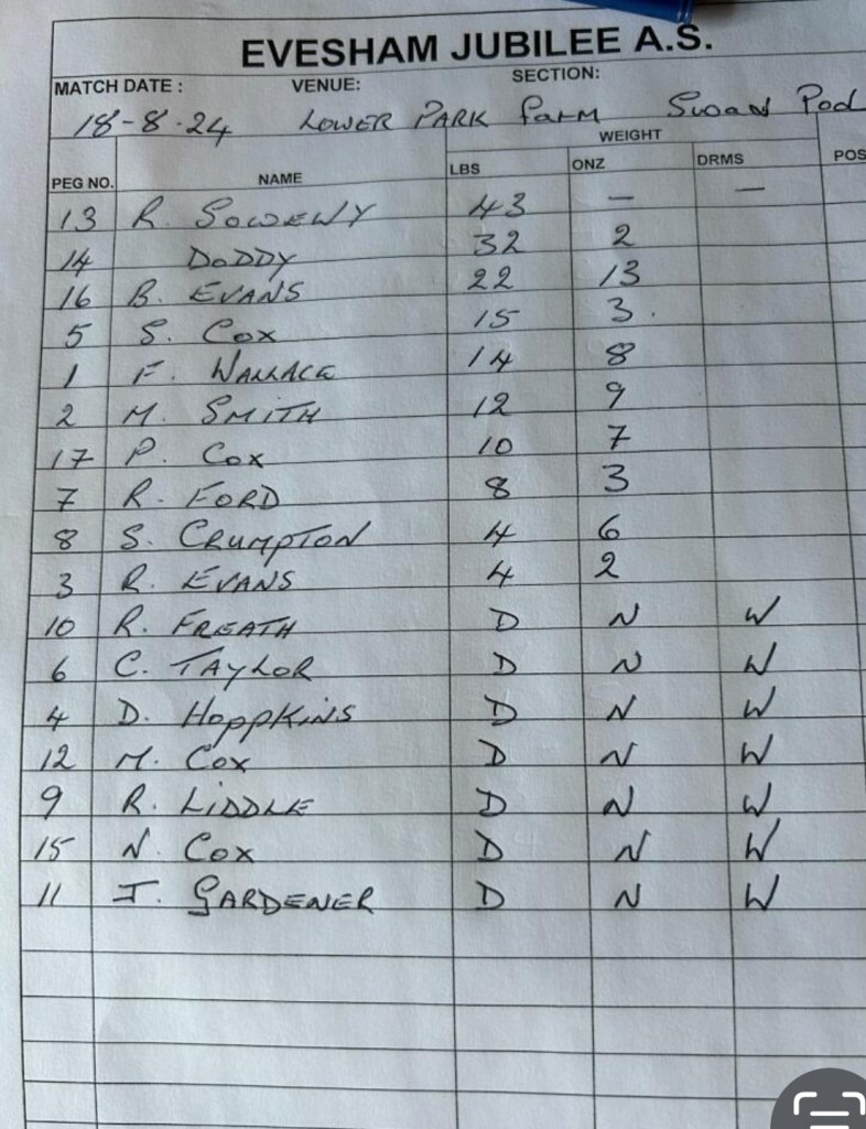 Jubilee members fished the latest club match on the Swan pool at Lower Park Fishery at Redditch, where the fishing was patchy for some with several DNW’s and only 7 anglers managing to get into double figures. However some anglers caught some fish.